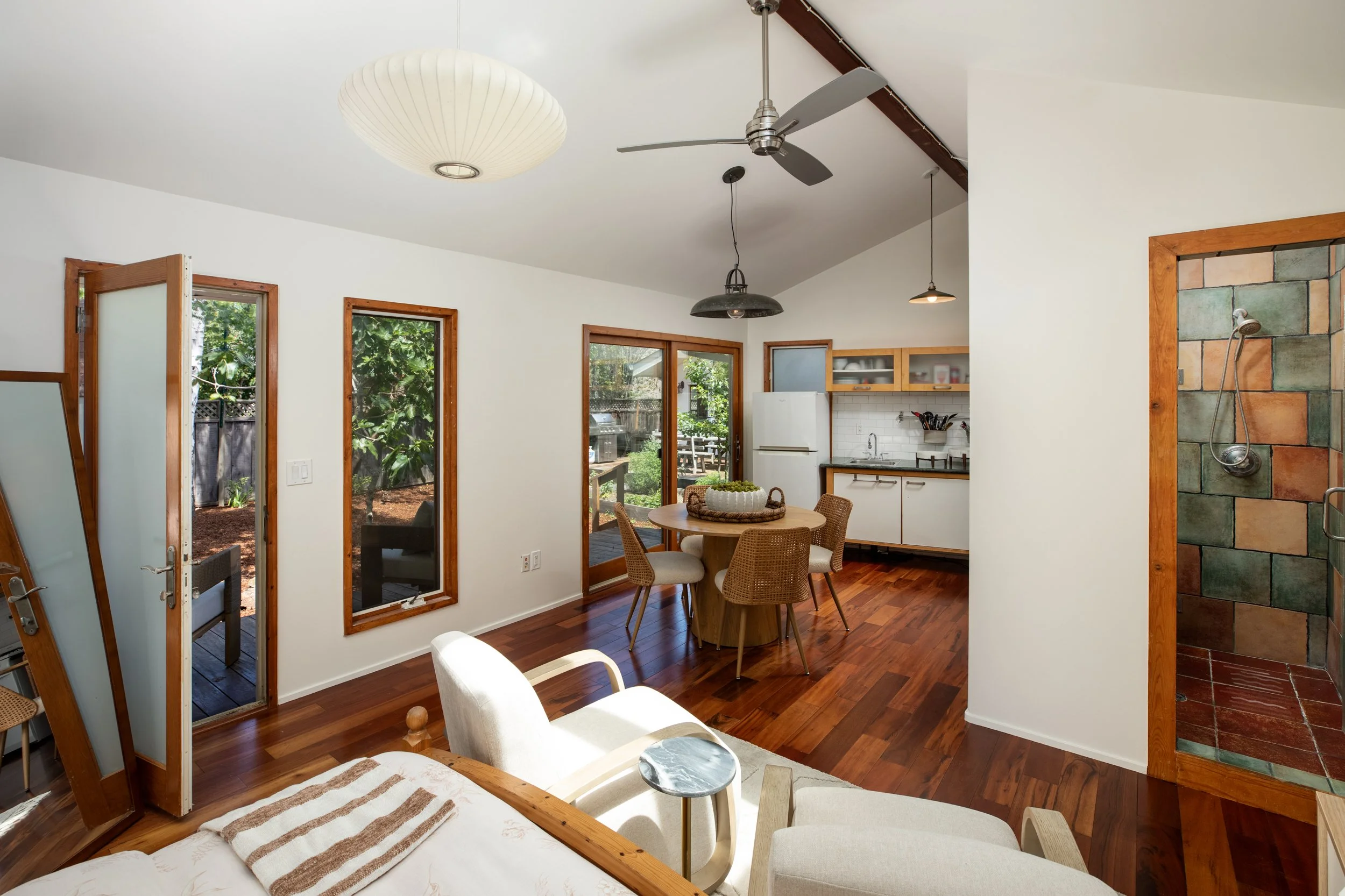 Guest house of approximately 371 sq ft with hardwood floors, kitchen, laundry, full bath, and porch