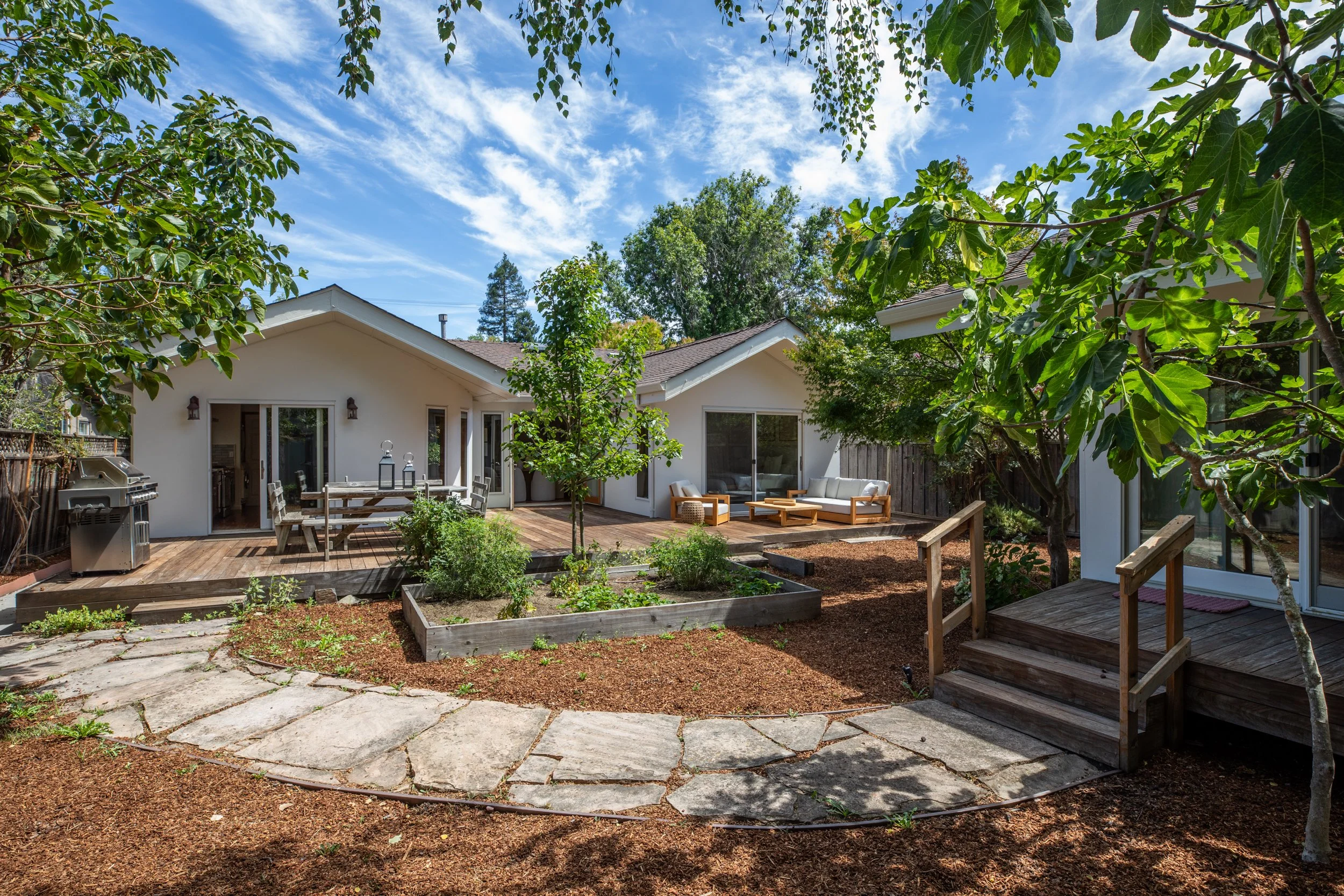 The primary bedroom boasts a vaulted ceiling, sliding doors to the yard, and a customized walk-in closet. The full bath is beautifully finished with tiled walls, a dual vanity, tub, glass-enclosed shower, and separate commode. Outdoors, enjoy a south-facing backyard with a large entertaining deck, vegetable beds, mature shade trees, and a spacious storage shed. A private guest house offers a vaulted ceiling, full kitchen, laundry, hardwood floors, full bath, dining area, and its own porch—perfect for guests or home office. Ideally located near shopping, parks, and easy access to Highway 101.
